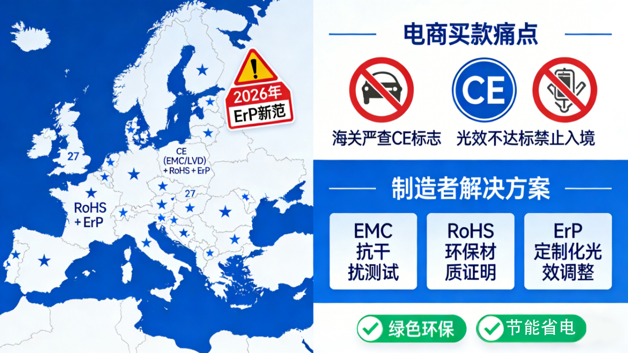 2.2电商卖家的痛点: 欧洲海关严查电子产品的 CE 标志。此外,2026 年执行的最新 ErP(能源相关产品)指令 要求极高,光效达不到标准的产品将被禁止进入欧盟市场。